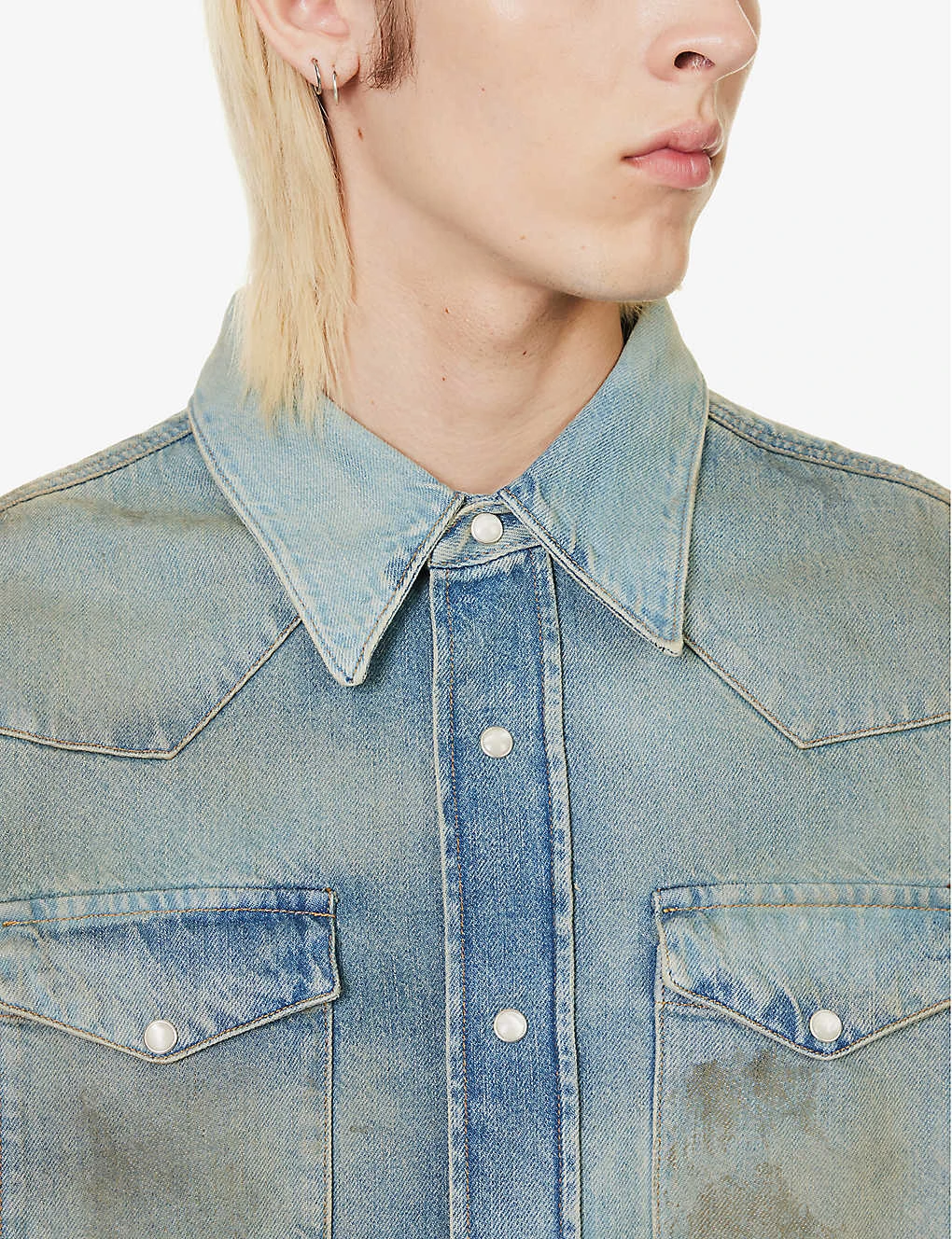 - Relaxed fit, long sleeves, pleated cuffs, two popper-fastened flap pockets at chest, western yoke, brand patch at side, distressed and discoloured finish, curved hem