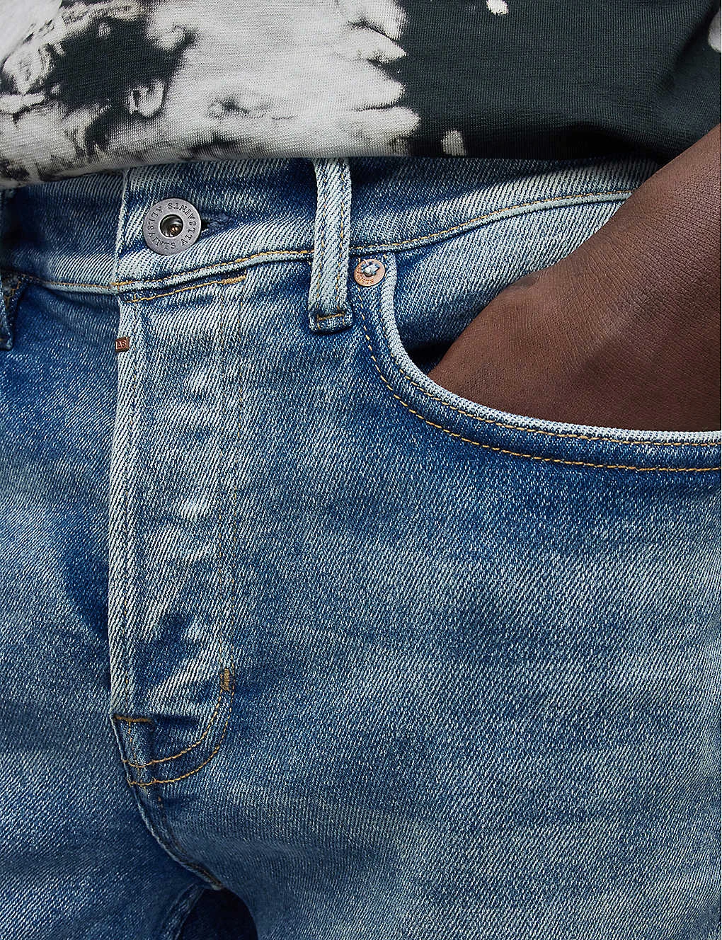 - Slim fit, mid-rise, skinny leg, belt loops, five pockets, faded wash, branded patch at back waistband, v-shaped yoke at back
