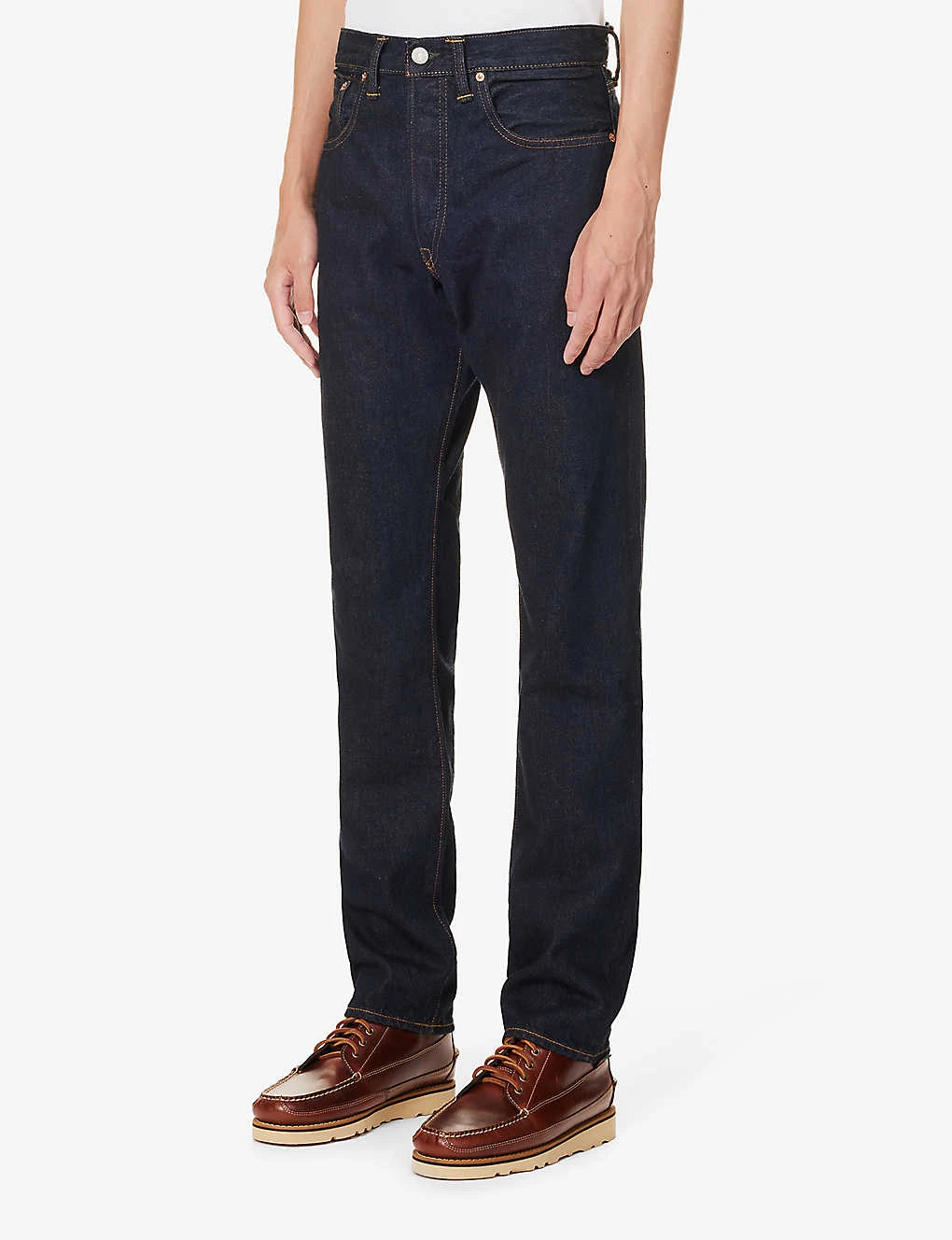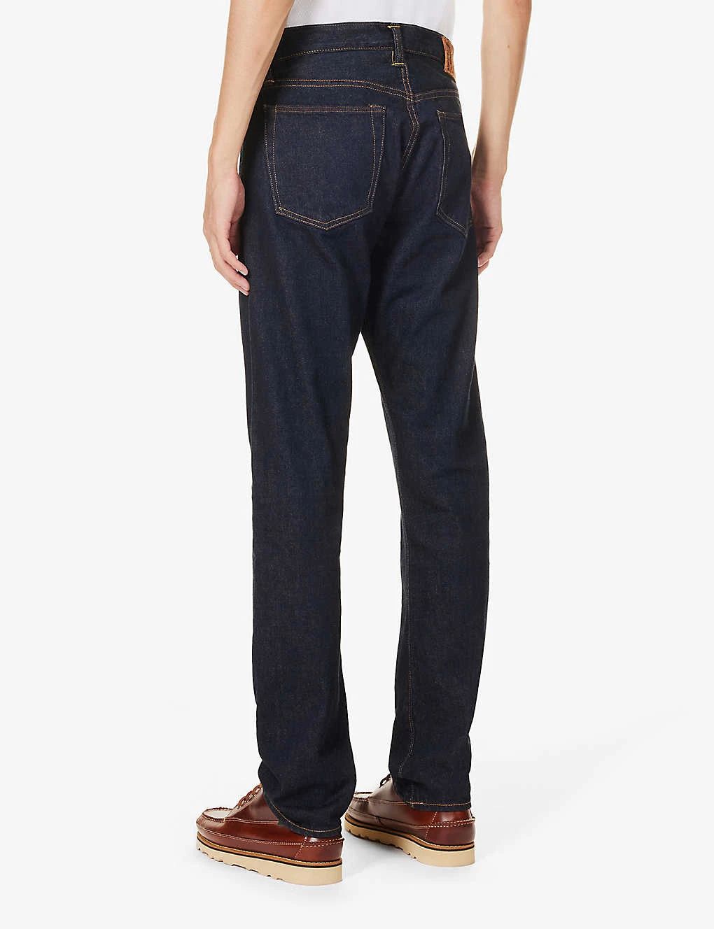 - Slim fit, mid-rise, straight leg, belt loops, five pockets, brand embroidery at front, brand patch at back, straight cuffs