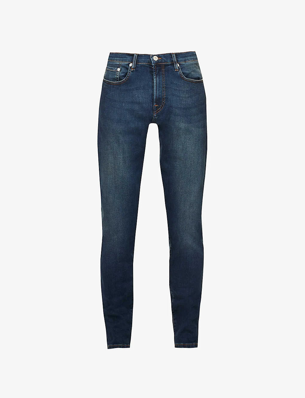 - Regular-fit, mid-rise, tapered leg, belt loops, five pockets, branded silver-toned hardware, all-over faded wash and whiskering, contrast stitching, brand patch at back, wide V-shaped yoke at back, partially lined