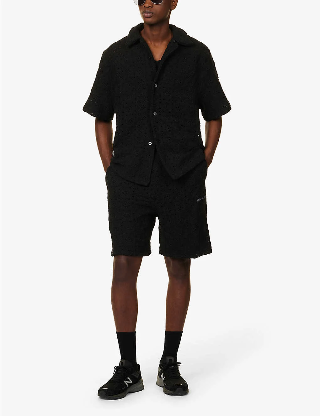- Relaxed fit, short sleeves, all-over crochet knit, embroidered branding at back