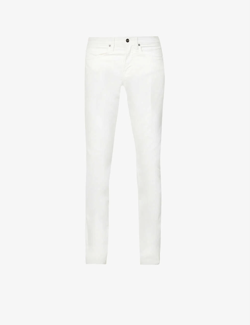 - Slim fit, mid rise, tapered leg, belt loops, five pockets, straight cuffs