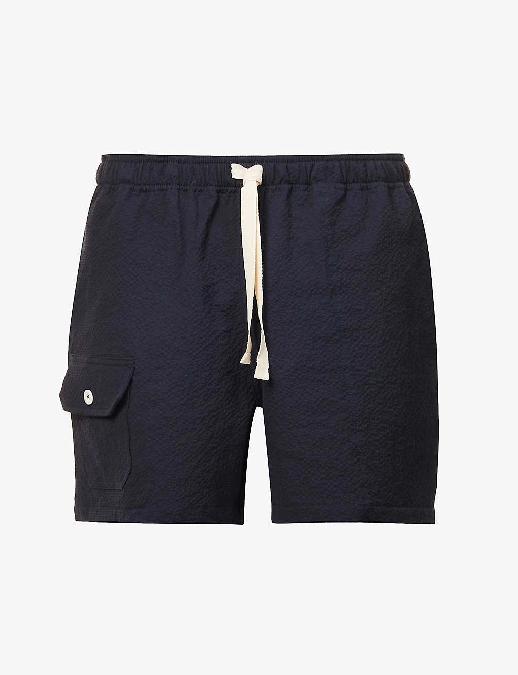 - Regular fit, mid-rise, elasticated drawstring waistband, two slip pockets at sides, buttoned flap pocket at front, patch pocket at back, seersucker texture, partially lined