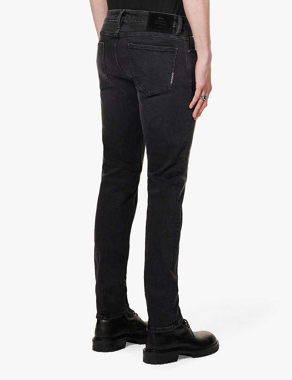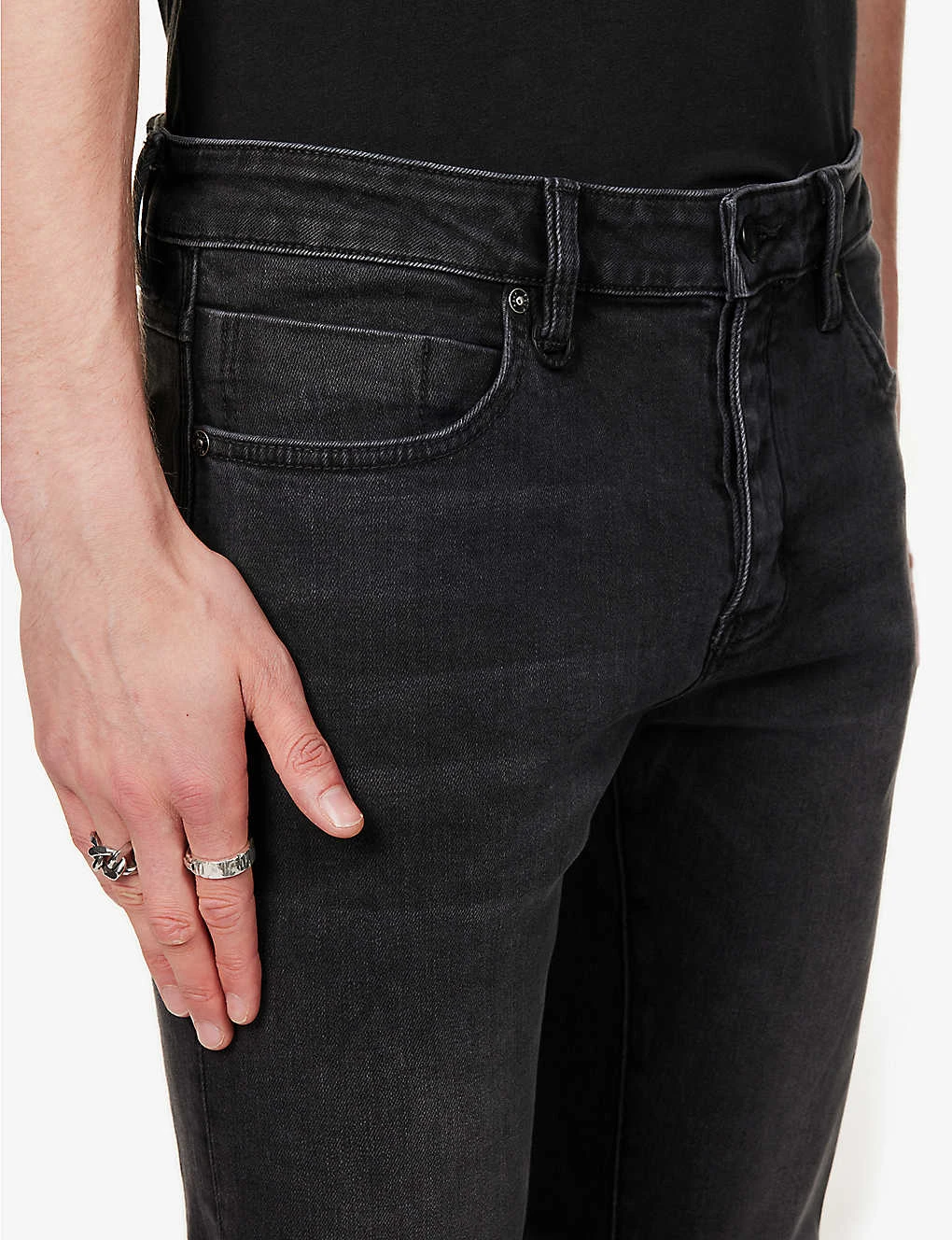 - Slim fit, tapered leg, mid rise, belt loops, branded hardware, five pockets, whiskering, branded patch at backm all-over faded wash, partially lined