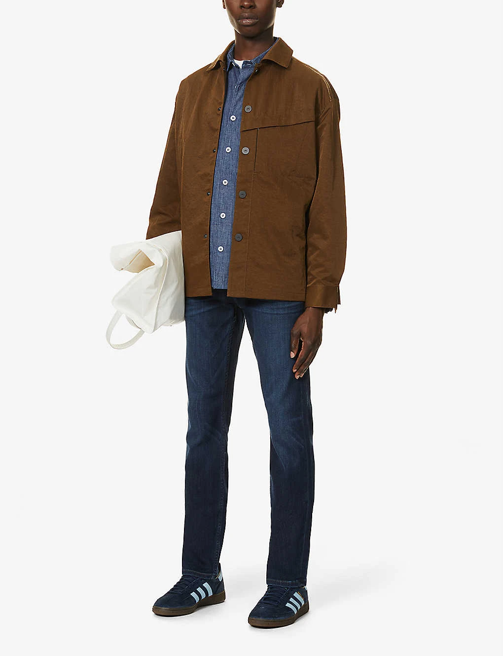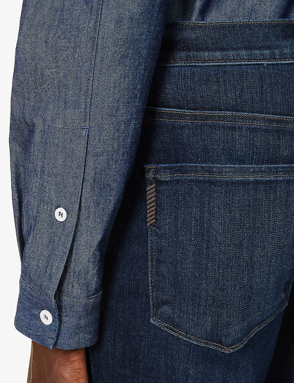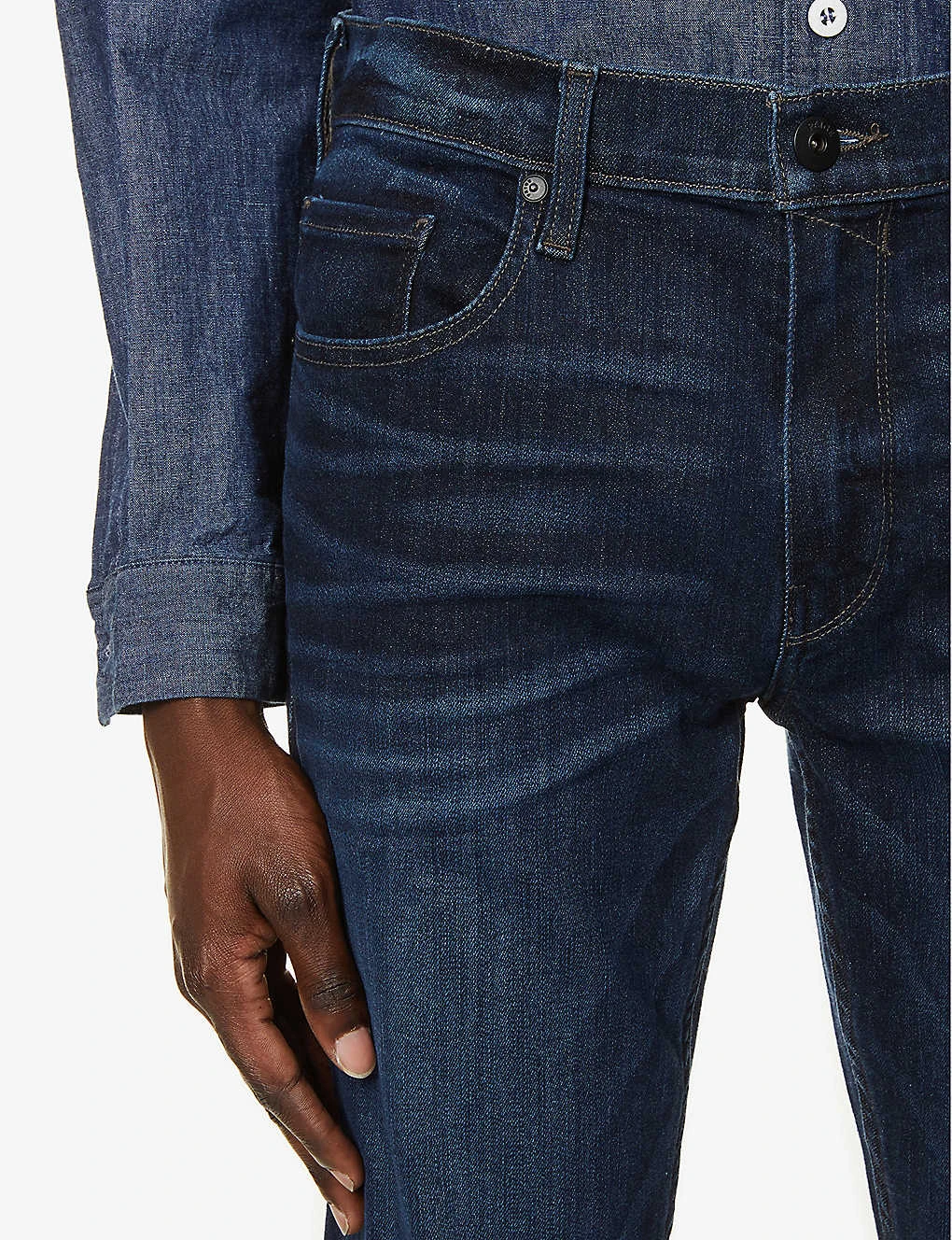 - Exposed button and concealed zip-fly fastenings at front