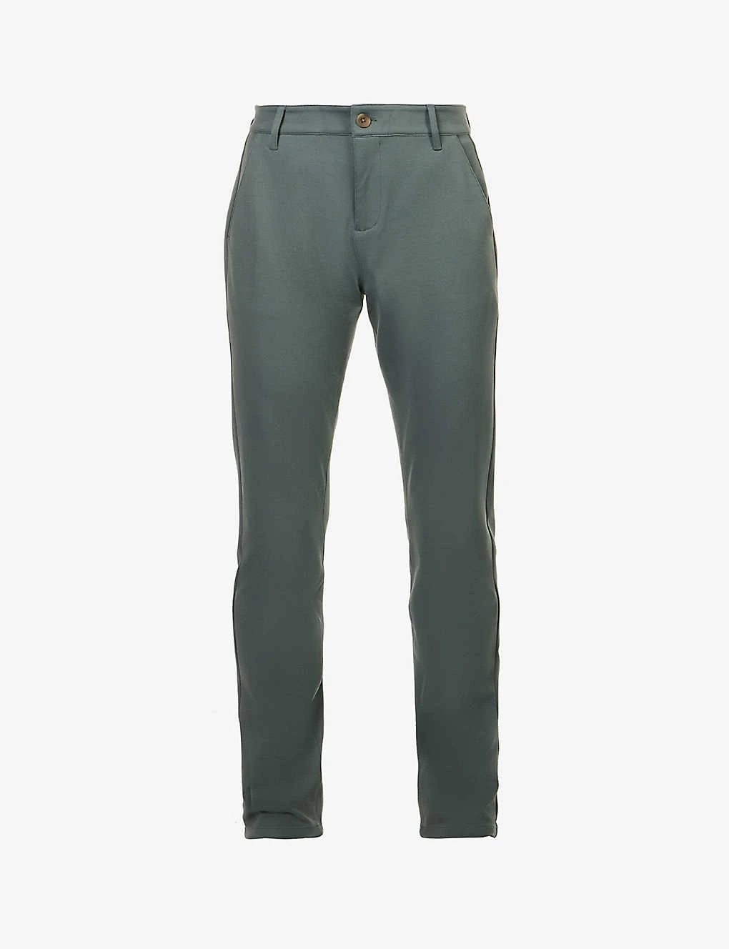 - Regular fit, mid rise, slim leg, belt loops, two slip pockets at front, two buttoned welt pockets at back