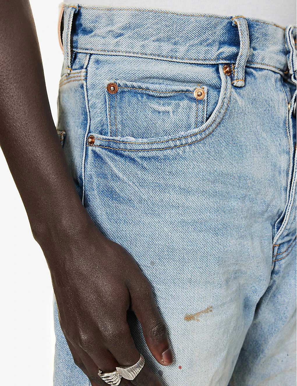 - Regular fit, mid-rise, straight leg, belt loops, branded hardware, belt loops, five pockets, branded patch at back, all-over faded wash and paint splatter, distressed finish and crinkle texture, partially lined