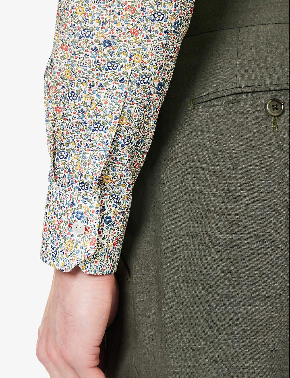 - Regular-fit, long sleeves, buttoned cuffs, pearlescent buttons, all-over ditsy floral pattern, dipped at back, curved hem