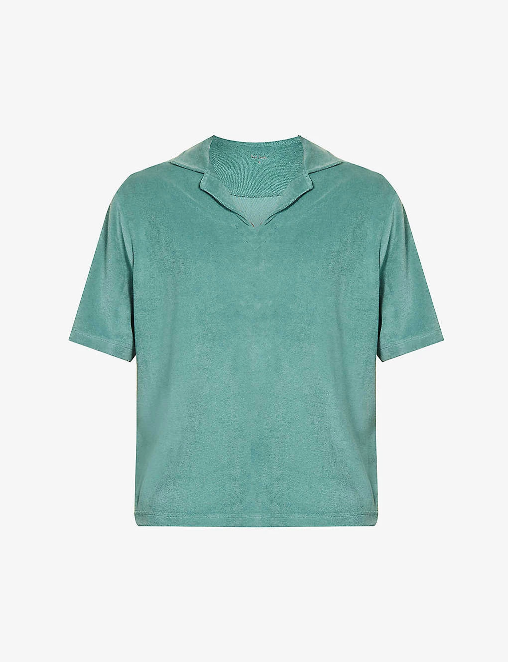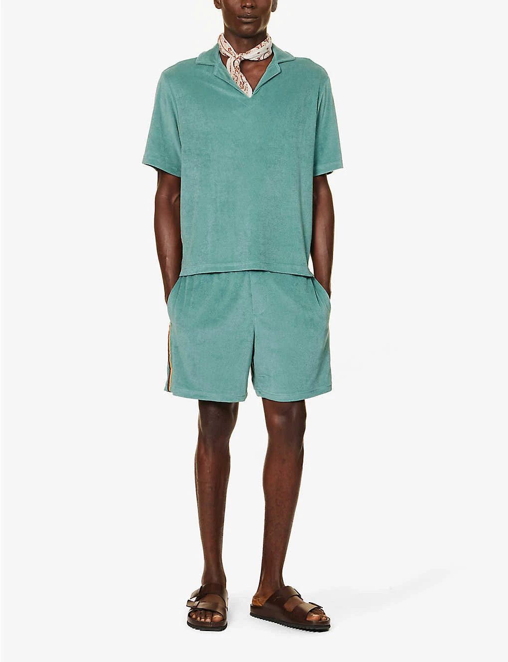 - Regular fit, open collar, short sleeves, striped panels at sides, brand patch at front, towelling texture, split hem at sides