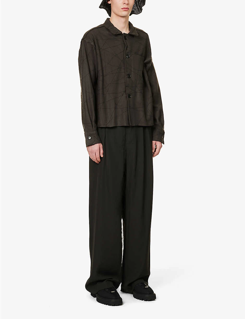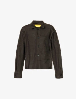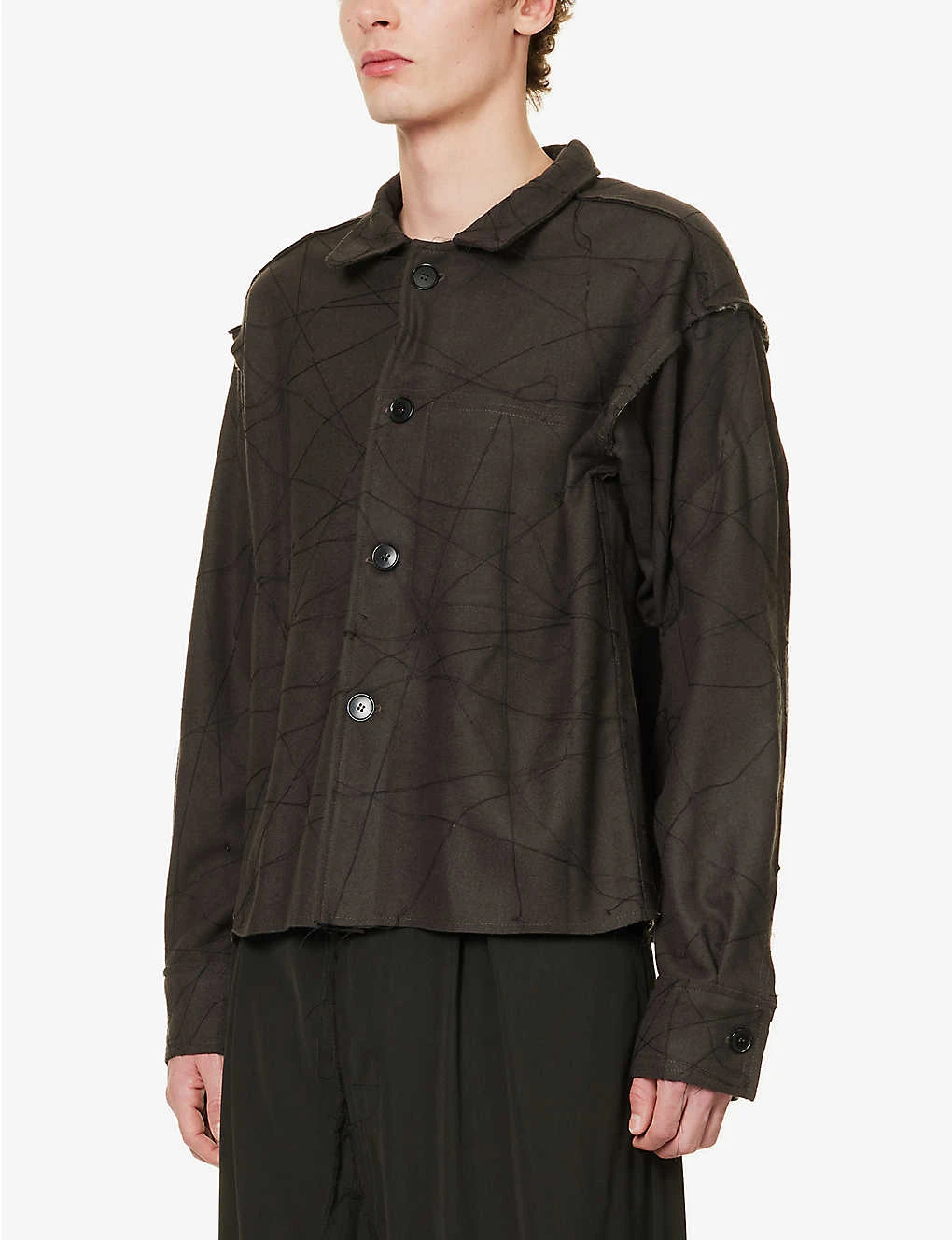 - Regular fit, collar, long sleeves, buttoned sleeve hems, patch pocket at chest, straight yoke with pleat at back, all-over loose thread design, raw trims, soft brushed texture