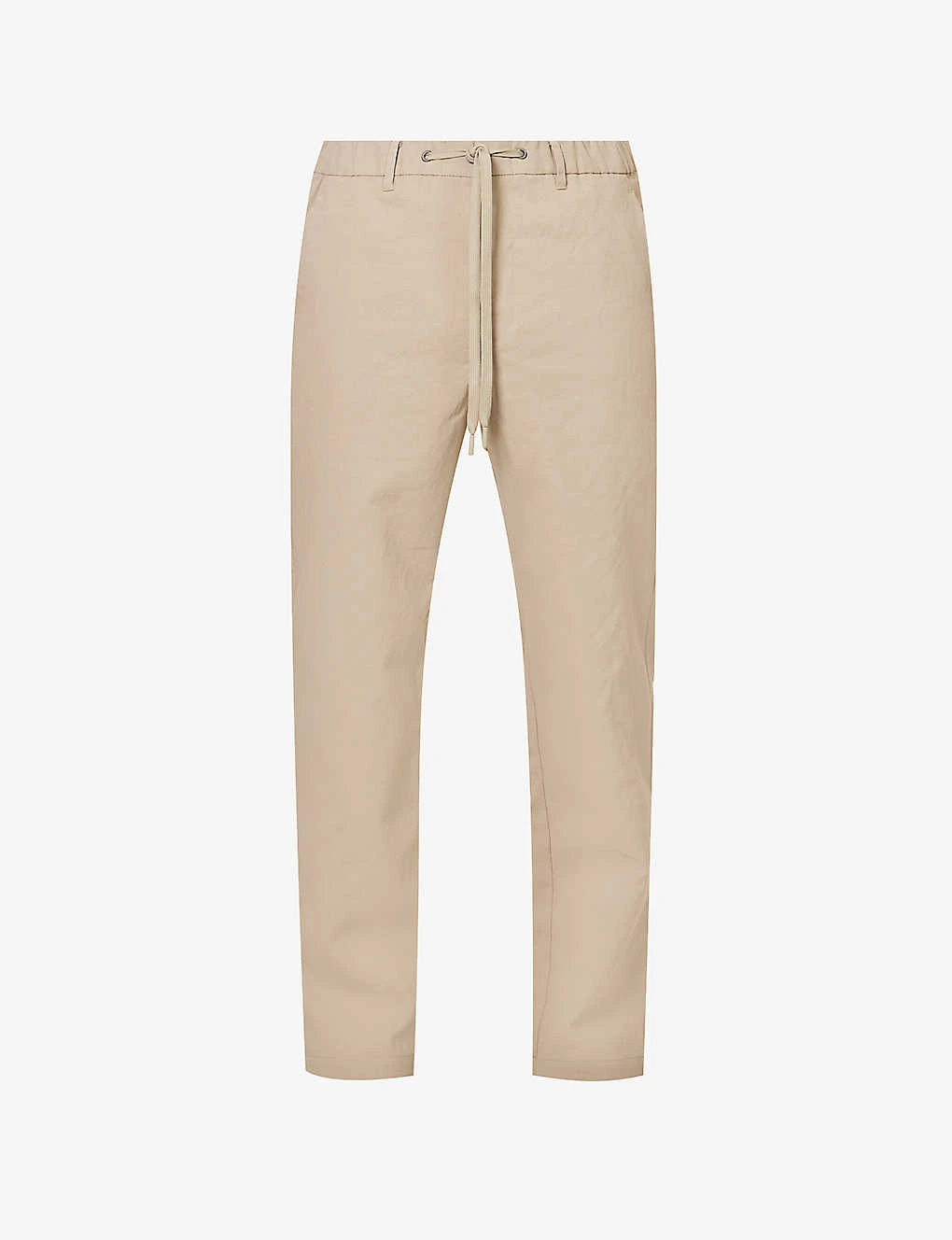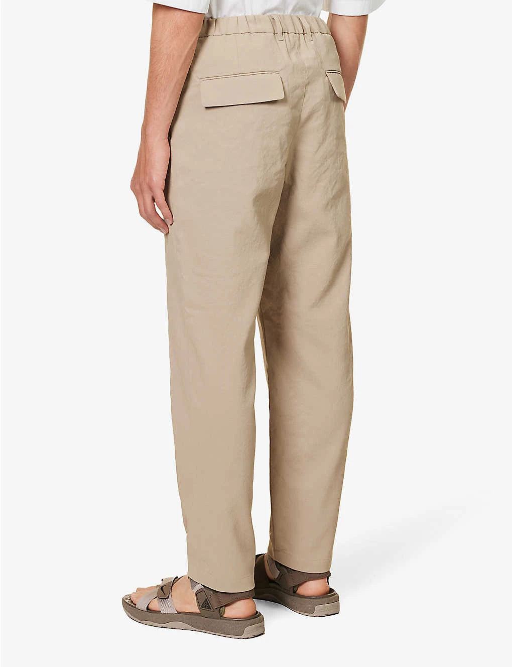 - Regular fit, mid-rise, tapered leg, elasticated drawstring waistband, belt loops, two slip pockets at sides, darts at back, two flap pockets at back, partially lined