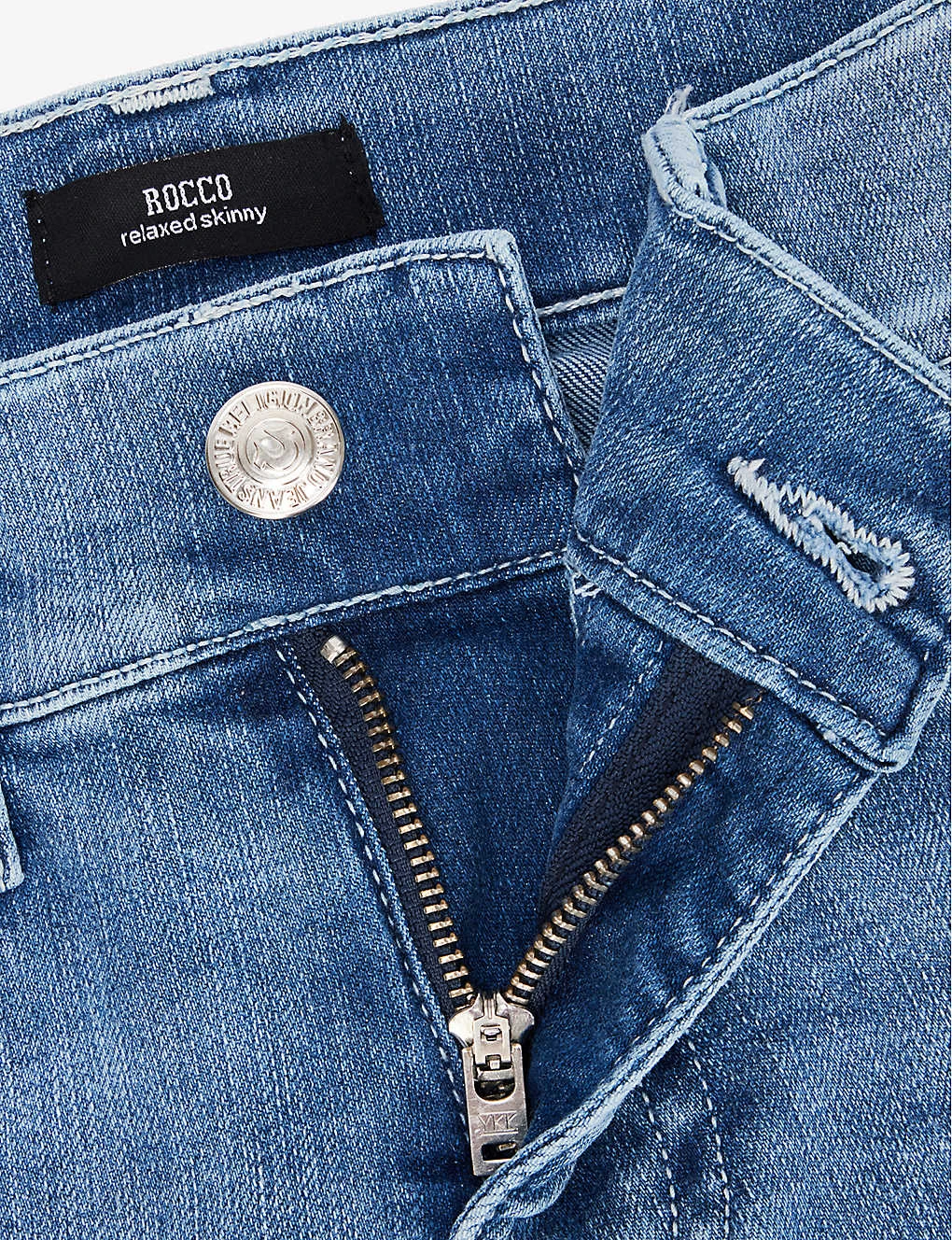 - Slim fit, mid rise, skinny leg, belt loops, five pockets, brand patch at back, exposed stitching, faded wash