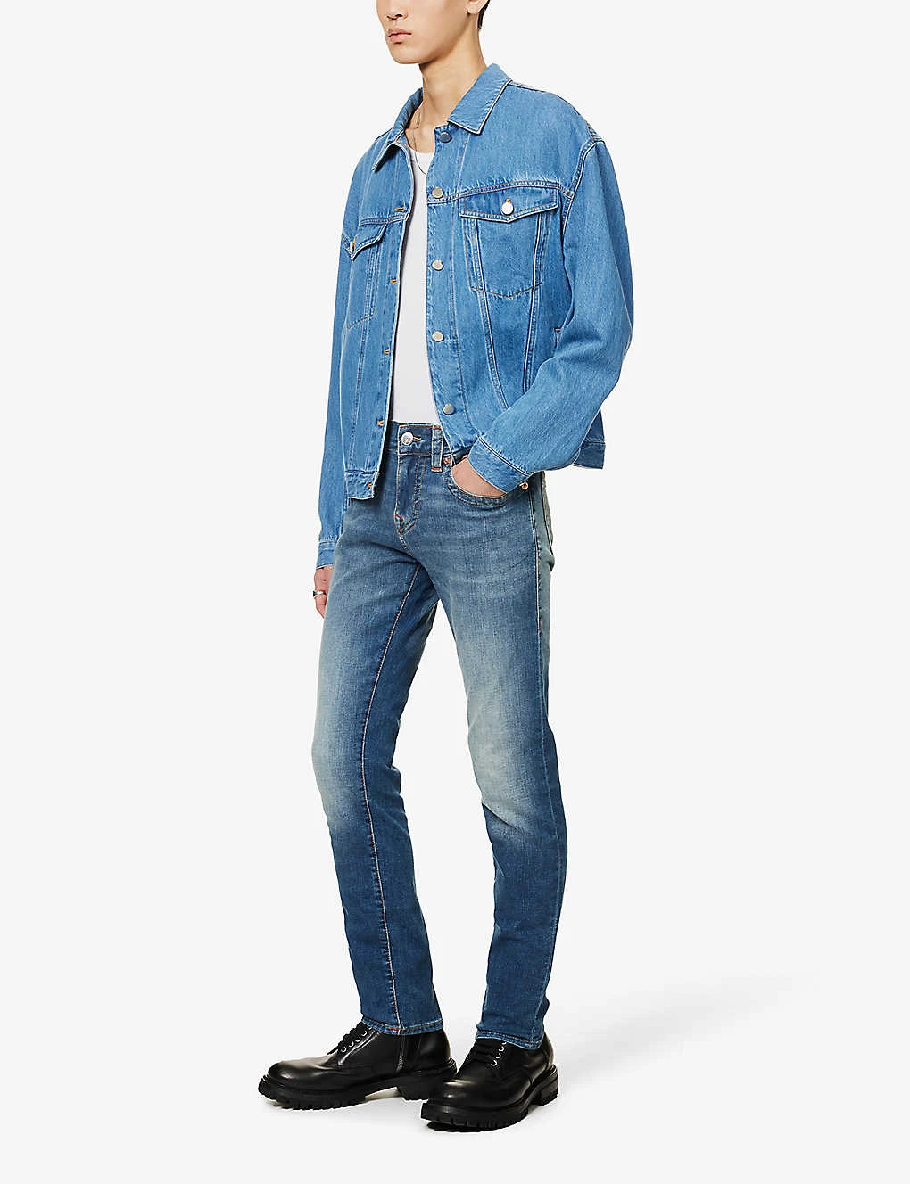 - Slim fit, mid-rise, tapered leg, belt loops, contrast stitching, branded hardware, five pockets, whiskering, branded patch at back, embroidered branding at back, all-over faded panels, partially lined