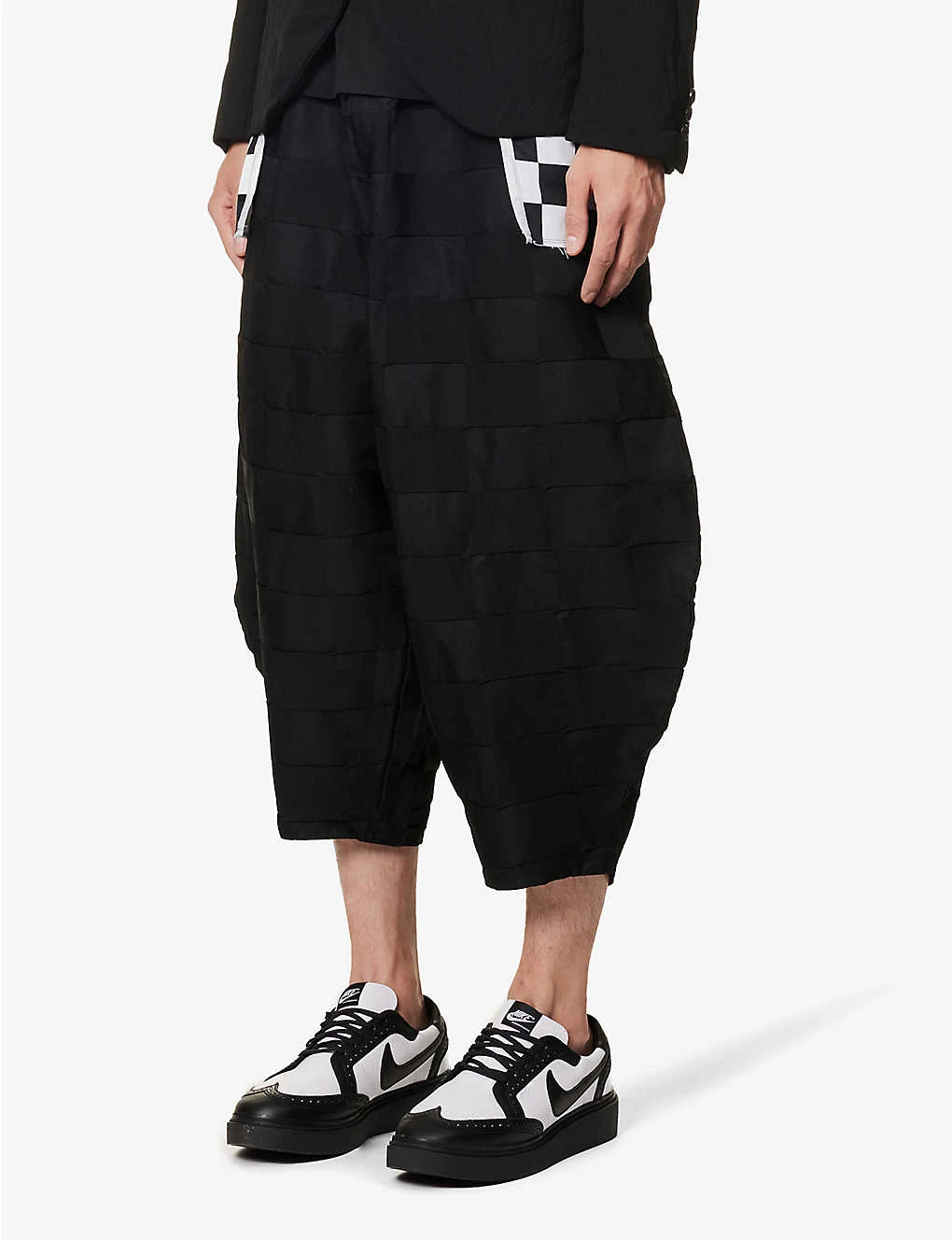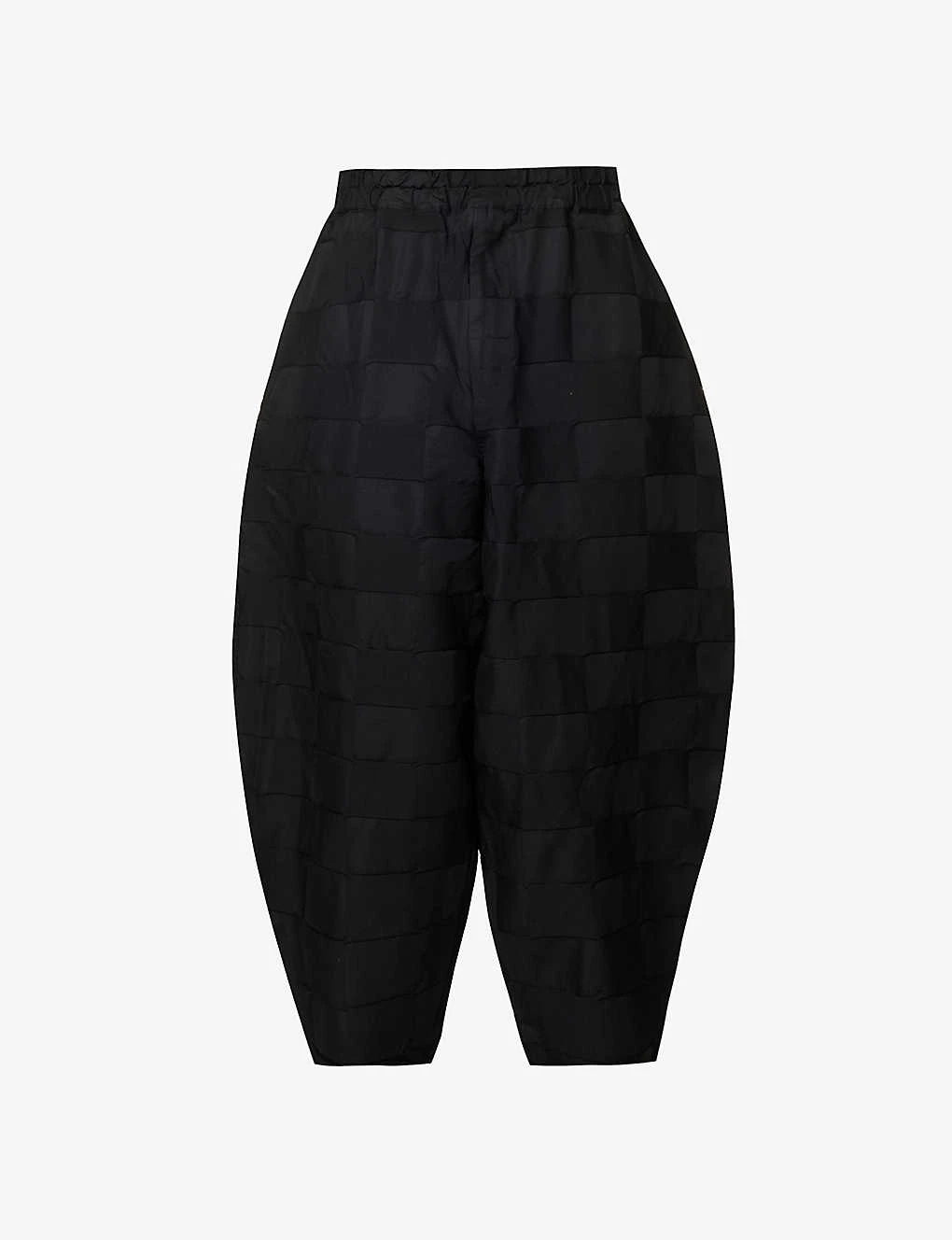 Relaxed fit, high-rise, wide balloon leg, drawstring elasticated waistband, two slip pockets at front, buttoned and slip pockets at back, all over embossed check pattern, straight cuffs