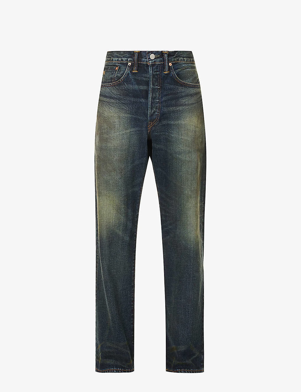- Regular fit, mid-rise, straight leg, belt loops, five pockets, brand embroidery at front, brand patch at back, faded wash and whiskering, straight cuffs